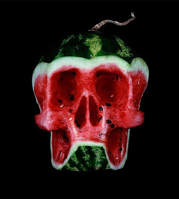 Unik dan kreatif! buah buahan seperti epal, dan tembikai diukir menyerupai tengkorak manusia.